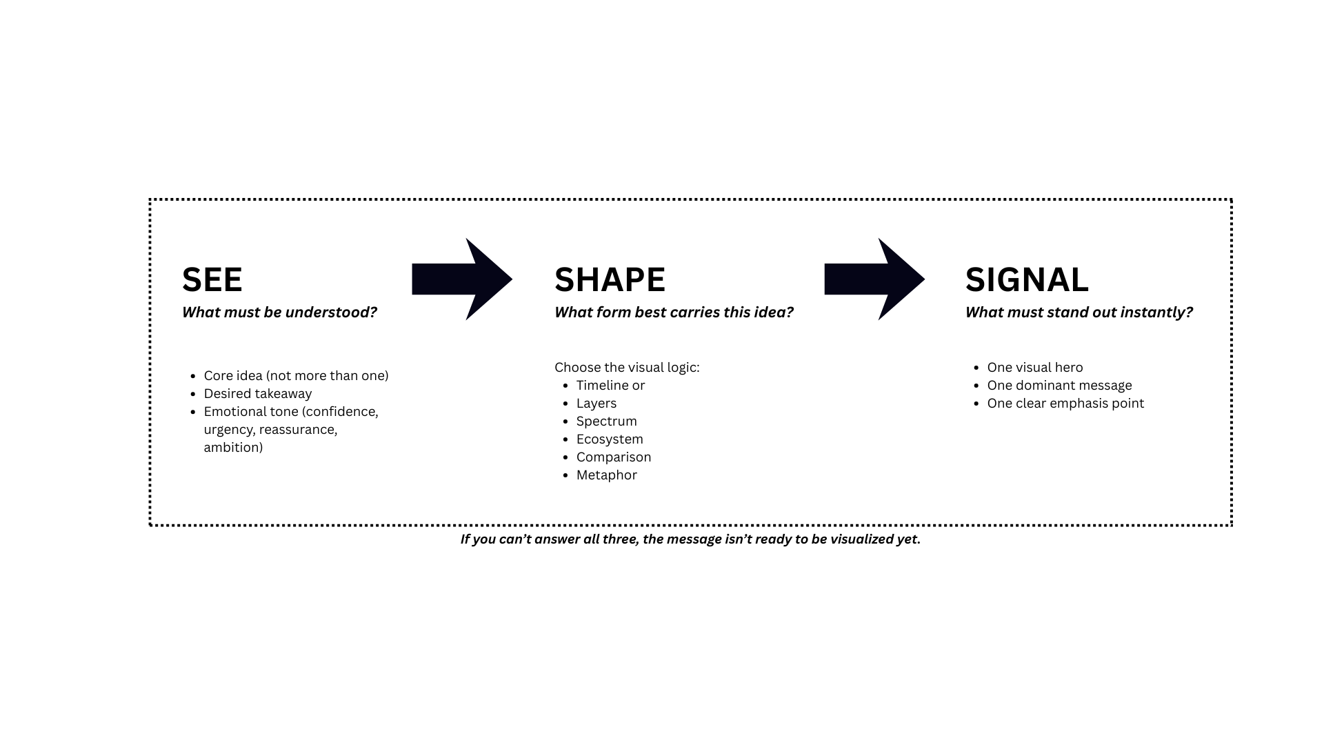 SEE · SHAPE · SIGNAL is a practical system for designing messages that remain clear under noise. It forces decisions in the right order – meaning first, structure next, emphasis last.